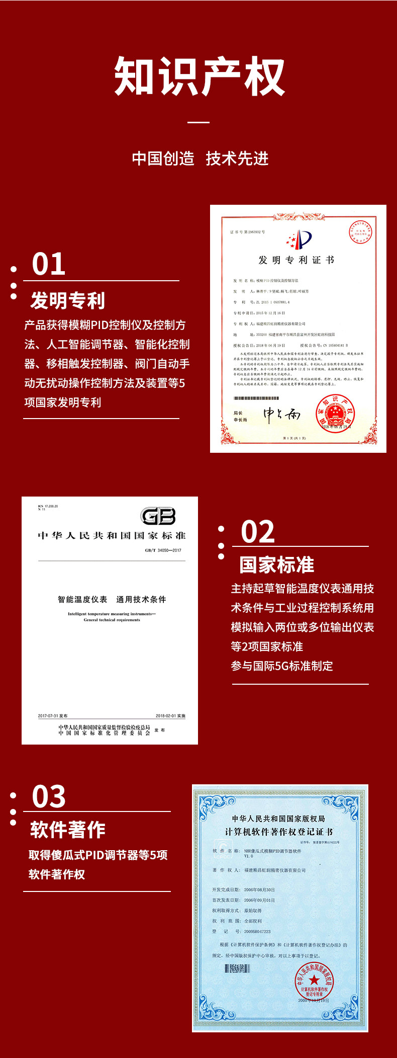 虹潤公司是專業(yè)生產(chǎn)溫控器的國家專精特新“小巨人”企業(yè)。生產(chǎn)的傻瓜式智能溫控器,具有傻瓜式操作,真正人工智能算式,無需人工整定參數(shù),控制精度可達(dá)±0.1°C,高抗干擾等特點。產(chǎn)品獲得模糊PID控制儀及控制方法、人工智能調(diào)節(jié)器、智能化控制器、移相觸發(fā)控制器、閥門自動手動無擾動操作控制方法及裝置等5項國家發(fā)明專利,主持起草智能溫度儀表通用技術(shù)條件、工業(yè)過程控制系統(tǒng)用模擬輸入兩位或多位輸出儀表、工業(yè)過程測量和控制系統(tǒng)用智能調(diào)節(jié)器等3項國家標(biāo)準(zhǔn),參與國際5G標(biāo)準(zhǔn)制定,取得傻瓜式模糊PID調(diào)節(jié)儀等3項相關(guān)軟件著作權(quán)。產(chǎn)品廣泛應(yīng)用于電力、石化,冶金、制藥、食品等幾乎所有工業(yè)現(xiàn)場,實現(xiàn)精準(zhǔn)控溫,保障生產(chǎn)安全與質(zhì)量。