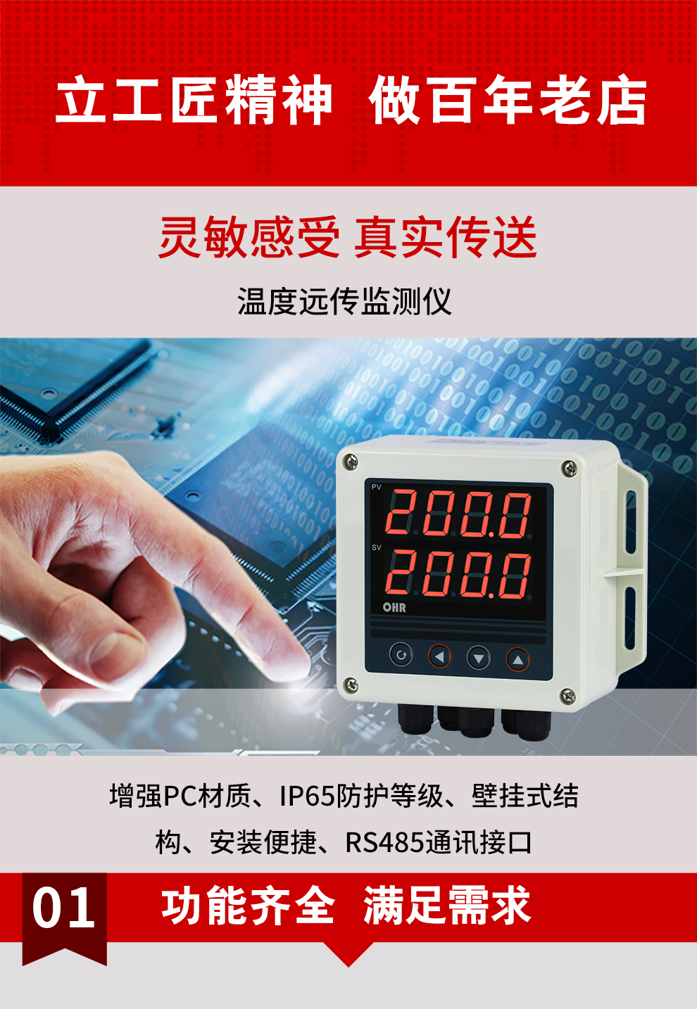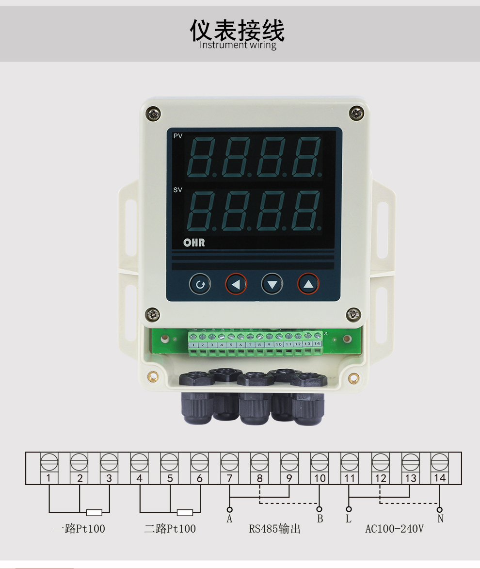 OHR-XTRT系列溫度遠(yuǎn)傳監(jiān)測(cè)儀采用了表面貼裝工藝,全自動(dòng)貼片機(jī)生產(chǎn),具有很強(qiáng)的抗干擾能力。本儀表支持兩路PT100輸入,實(shí)現(xiàn)對(duì)溫度物理的測(cè)量顯示,帶RS485通訊輸出功能,帶雙屏數(shù)碼管顯示,上窗口顯示第1路測(cè)量值,下窗口顯示第2路測(cè)量值。