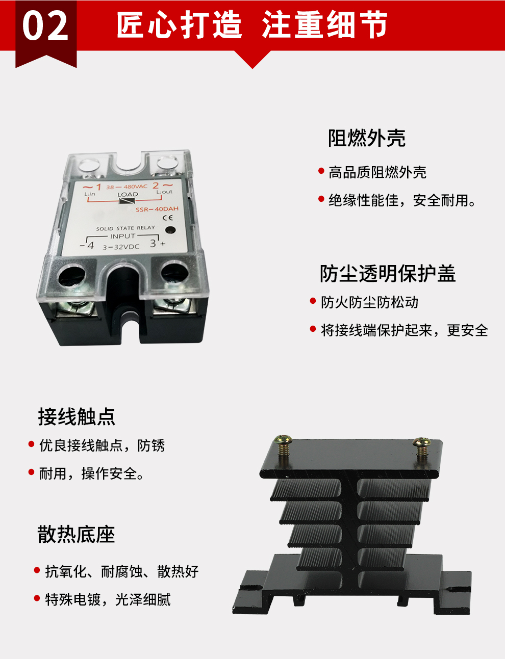 OHR-SSR固態(tài)繼電器尺寸小巧,內(nèi)置壓敏電阻及阻容吸收回路,具有吸收電網(wǎng)尖峰電壓抗干擾能力??赏ㄟ^動作指示燈來檢查工作狀態(tài),寬電壓輸出,可達到AC38-480V,低觸發(fā)電流小干8mA。