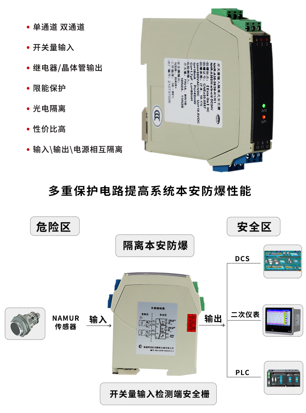 OHR-A35系列開關(guān)量輸入檢測端隔離柵接受來自危險區(qū)的開關(guān)或接近開關(guān)輸入,通過安全柵隔離輸出到安全側(cè)的繼電器或晶體管輸出,它具有輸入狀態(tài)檢測指示,可進(jìn)行正反向控制,該產(chǎn)品需獨立供電,輸入/輸出/電源三隔離。