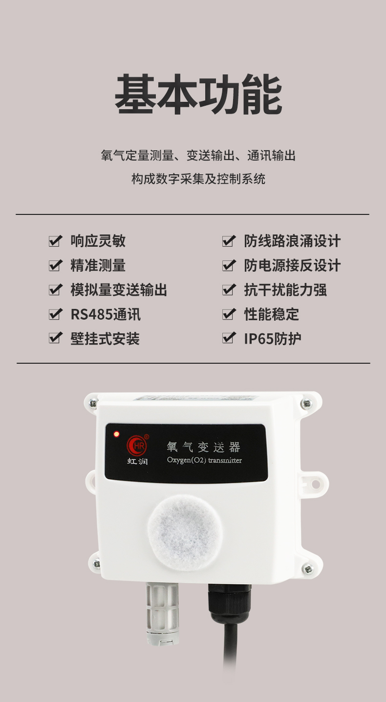 虹潤公司是專業(yè)生產(chǎn)環(huán)境監(jiān)測儀表的國家專精特新“小巨人”企業(yè)。生產(chǎn)的氧氣變送器,具有采用電化學(xué)原理,響應(yīng)靈敏,準(zhǔn)確度高,低功耗,模擬量變送輸出或RS485通訊等特點。產(chǎn)品獲得一種農(nóng)業(yè)監(jiān)控變送器、一種儀表電源等2項實用新型專利,主持起草現(xiàn)場設(shè)備工具(FDT)接口規(guī)范、物聯(lián)網(wǎng)總體技術(shù)智能傳感器特性與分類等2項國家標(biāo)準(zhǔn),參與國際5G標(biāo)準(zhǔn)制定,取得農(nóng)業(yè)監(jiān)控變送器等3項相關(guān)軟件著作權(quán)。產(chǎn)品廣泛應(yīng)用于機(jī)房、配電站、地下車庫、工廠倉庫、食品儲存、養(yǎng)殖場、果蔬林園等環(huán)境場合對氧氣濃度的檢測。