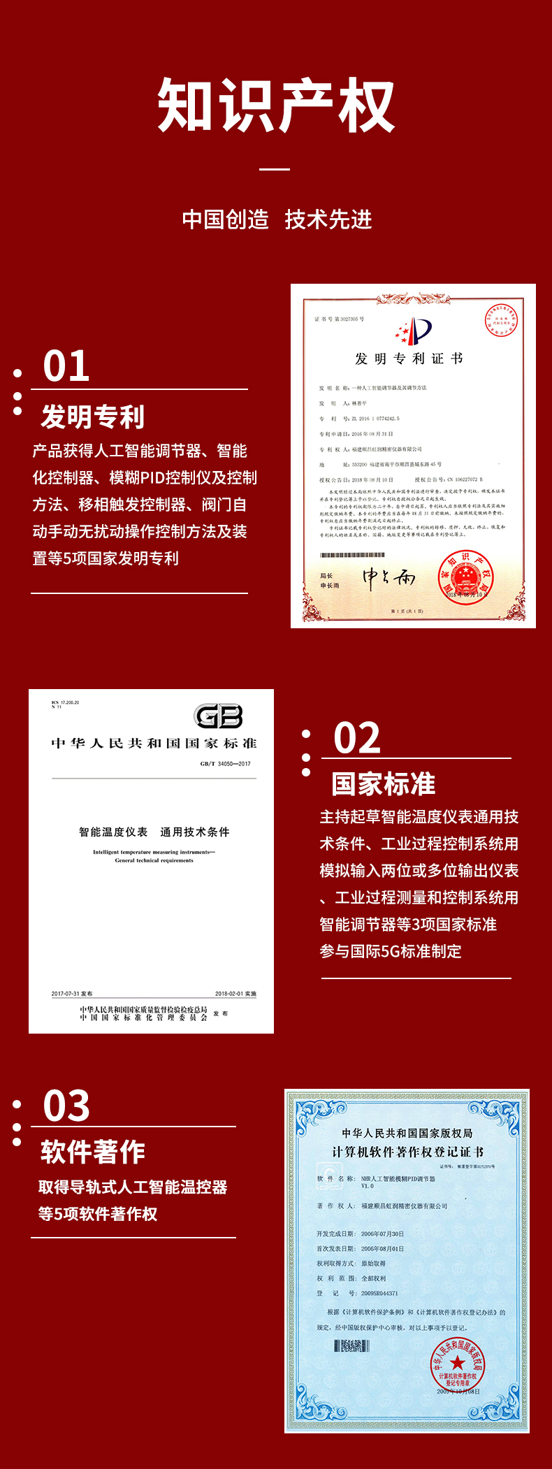 虹潤公司是專業(yè)生產溫控器的國家專精特新“小巨人”企業(yè)。生產的導軌式人工智能溫控器,具有真正人工智能算式,無需人工整定參數,控制精度可達±0.1°C,高抗干擾,帶485通訊輸出等特點。產品獲得人工智能調節(jié)器、智能化控制器、模糊PID控制儀及控制方法、移相觸發(fā)控制器、閥門自動手動無擾動操作控制方法及裝置等5項國家發(fā)明專利,主持起草智能溫度儀表通用技術條件、工業(yè)過程控制系統用模擬輸入兩位或多位輸出儀表、工業(yè)過程測量和控制系統用智能調節(jié)器等3項國家標準,參與國際5G標準制定,取得導軌式人工智能控制器等3項相關軟件著作權。產品廣泛應用于電力、石化,冶金、制藥、食品等幾乎所有工業(yè)現場,實現精準控溫,保障生產安全與質量。
