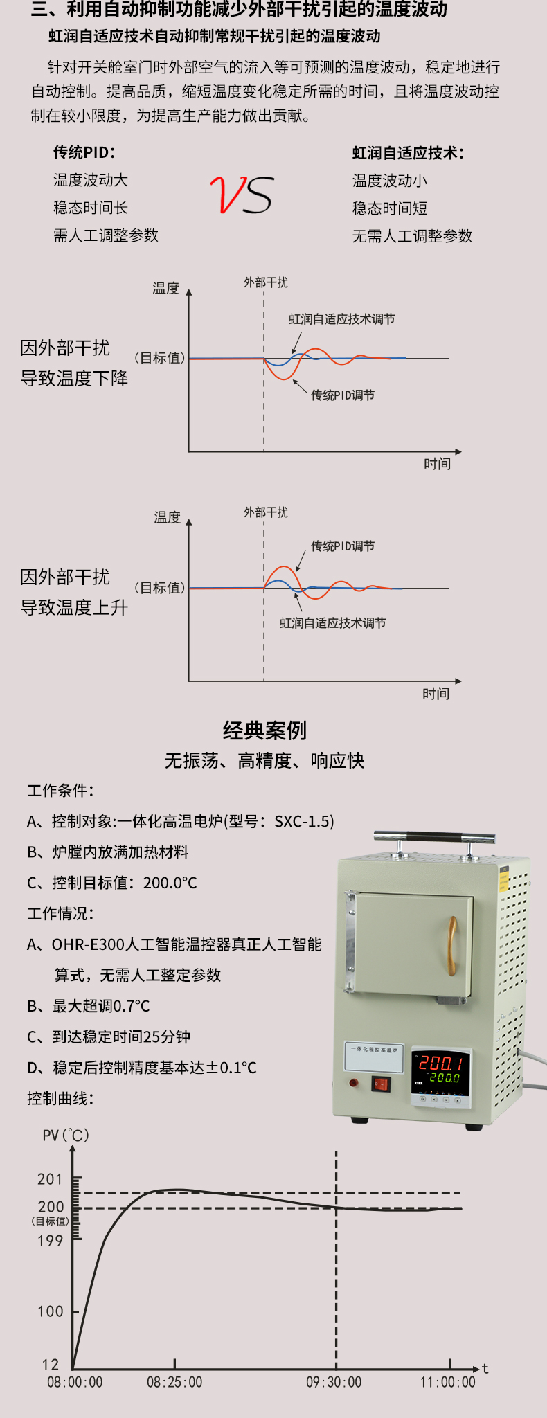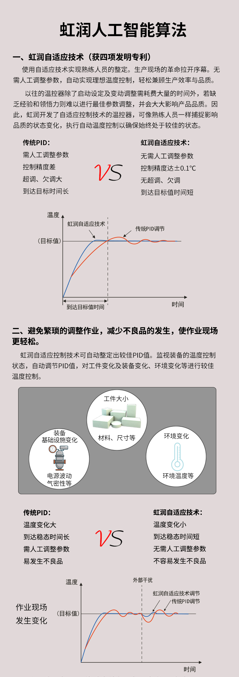 虹潤公司是專業(yè)生產(chǎn)溫控器的國家專精特新“小巨人”企業(yè)。生產(chǎn)的人工智能溫控器,具有真正人工智能算式,無需人工整定參數(shù),控制精度可達(dá)±0.1°C,多種輸出類型,高抗干擾等特點(diǎn)。產(chǎn)品獲得模糊PID控制儀及控制方法、人工智能調(diào)節(jié)器、智能化控制器、移相觸發(fā)控制器、閥門自動手動無擾動操作控制方法及裝置等5項(xiàng)國家發(fā)明專利,主持起草物聯(lián)網(wǎng)智能溫度儀表通用技術(shù)條件、工業(yè)過程控制系統(tǒng)用模擬輸入兩位或多位輸出儀表、工業(yè)過程測量和控制系統(tǒng)用智能調(diào)節(jié)器等3項(xiàng)國家標(biāo)準(zhǔn),參與國際5G標(biāo)準(zhǔn)制定,取得模糊PID溫控儀等3項(xiàng)相關(guān)軟件著作權(quán)。產(chǎn)品廣泛應(yīng)用于電力、石化,冶金、制藥、食品等幾乎所有工業(yè)現(xiàn)場,實(shí)現(xiàn)精準(zhǔn)控溫,保障生產(chǎn)安全與質(zhì)量。