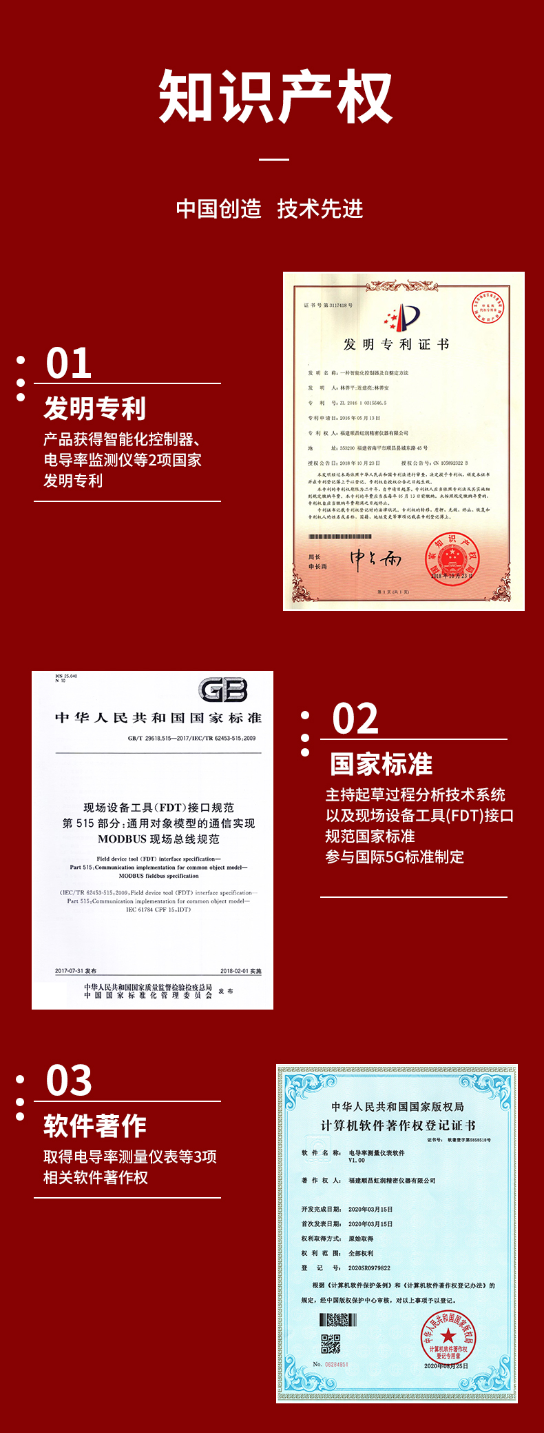 虹潤公司是專業(yè)生產(chǎn)水質(zhì)分析儀的國家專精特新“小巨人”企業(yè)。生產(chǎn)的電導(dǎo)率在線監(jiān)測儀,具有多元化安裝方式,IP65防護(hù)等級,多種類型輸出,測量穩(wěn)定不跳字,變送輸出精準(zhǔn)等特點。產(chǎn)品獲得智能化控制器、卡扣式安裝的儀表機殼等2項國家發(fā)明專利;主持起草現(xiàn)場設(shè)備工具(FDT)接口規(guī)范.,工業(yè)過程控制系統(tǒng)用模擬輸入兩位或多位輸出儀表、過程分析技術(shù)系統(tǒng)等3項國家標(biāo)準(zhǔn);參與國際5G標(biāo)準(zhǔn)制定,取得電導(dǎo)率測量儀表等2項相關(guān)軟件著作權(quán)。產(chǎn)品廣泛應(yīng)用于實驗室、水處理、環(huán)境監(jiān)測、食品、制藥、農(nóng)業(yè)等諸多領(lǐng)域。
