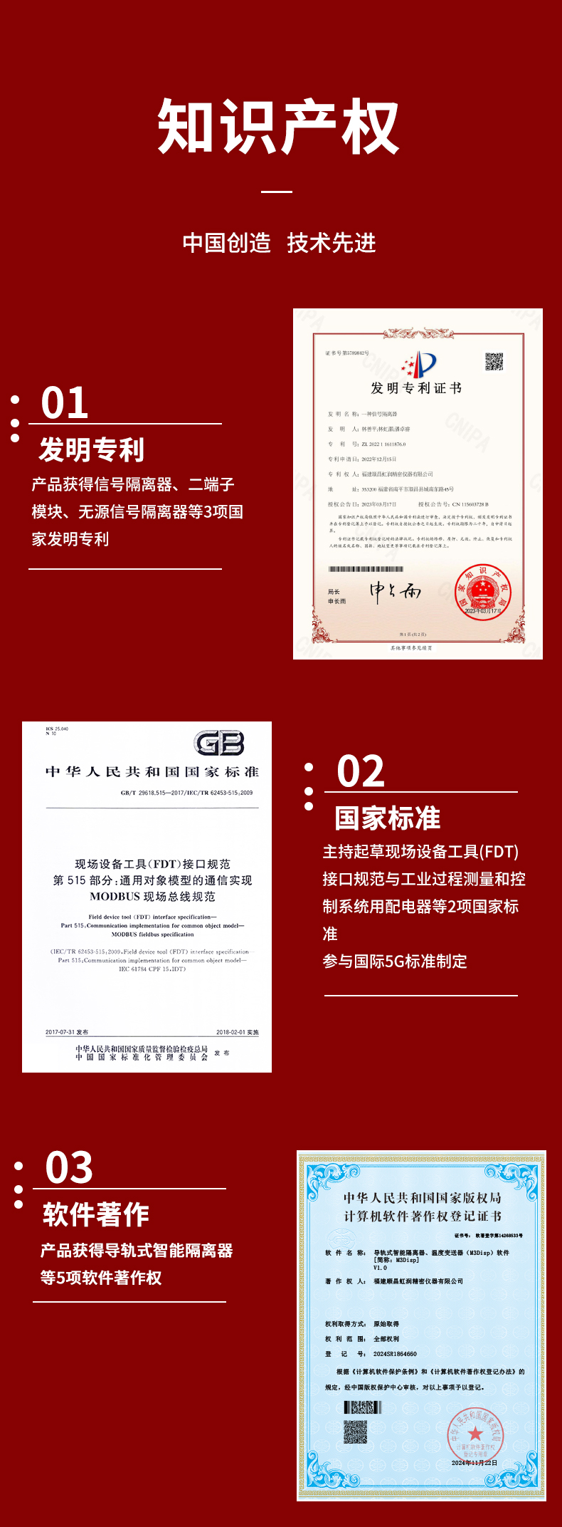虹潤(rùn)公司是專(zhuān)業(yè)生產(chǎn)隔離器的國(guó)家專(zhuān)精特新“小巨人”企業(yè)。生產(chǎn)的智能信號(hào)隔離器涵蓋電流電壓變送器、溫度變送器、配電器、頻率轉(zhuǎn)換器、開(kāi)關(guān)量轉(zhuǎn)換器及通訊轉(zhuǎn)換器等多種產(chǎn)品類(lèi)型。產(chǎn)品獲得信號(hào)隔離器、一種二端子模塊、無(wú)源信號(hào)隔離器等3項(xiàng)國(guó)家發(fā)明專(zhuān)利,主持起草現(xiàn)場(chǎng)設(shè)備工具(FDT)接口規(guī)范,工業(yè)過(guò)程測(cè)量和控制系統(tǒng)用配電器、工業(yè)過(guò)程測(cè)量和控制系統(tǒng)用隔離式安全柵等3項(xiàng)國(guó)家標(biāo)準(zhǔn),參與國(guó)際5G標(biāo)準(zhǔn)制定,取得導(dǎo)軌式智能隔離器、頻率轉(zhuǎn)換器等3項(xiàng)相關(guān)軟件著作權(quán)。產(chǎn)品廣泛電力、冶金、工業(yè)電爐、變電站、高壓電機(jī)房等需要電隔離的工業(yè)自動(dòng)化控制系統(tǒng)。