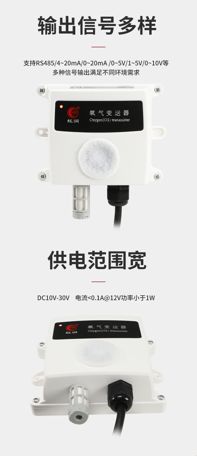 虹潤公司是專業(yè)生產(chǎn)環(huán)境監(jiān)測儀表的國家專精特新“小巨人”企業(yè)。生產(chǎn)的氧氣變送器,具有采用電化學(xué)原理,響應(yīng)靈敏,準(zhǔn)確度高,低功耗,模擬量變送輸出或RS485通訊等特點。產(chǎn)品獲得一種農(nóng)業(yè)監(jiān)控變送器、一種儀表電源等2項實用新型專利,主持起草現(xiàn)場設(shè)備工具(FDT)接口規(guī)范、物聯(lián)網(wǎng)總體技術(shù)智能傳感器特性與分類等2項國家標(biāo)準(zhǔn),參與國際5G標(biāo)準(zhǔn)制定,取得農(nóng)業(yè)監(jiān)控變送器等3項相關(guān)軟件著作權(quán)。產(chǎn)品廣泛應(yīng)用于機(jī)房、配電站、地下車庫、工廠倉庫、食品儲存、養(yǎng)殖場、果蔬林園等環(huán)境場合對氧氣濃度的檢測。