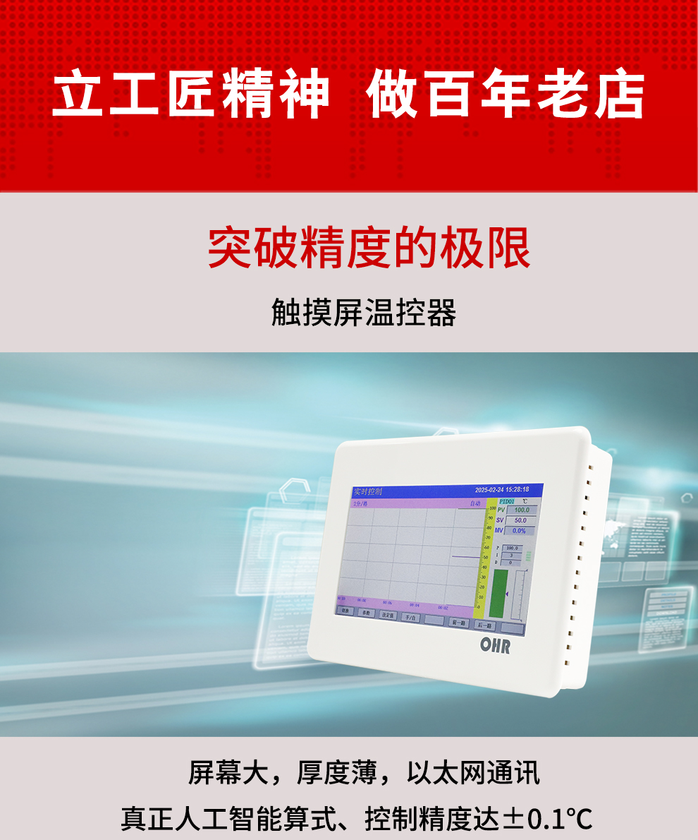 OHR系列觸摸屏溫控器采用真正的人工智能算式,儀表啟動自整定功能,可以根據(jù)被控對象的特性,自動尋找最優(yōu)參數(shù)以達到很好的控制效果,無需人工整定參數(shù)??販鼐然具_±0.1℃,無超調(diào)、欠調(diào),達國際先進水平。4路萬能信號輸入,可帶2路PID 控制,RS485通訊接口,以太網(wǎng)接口。